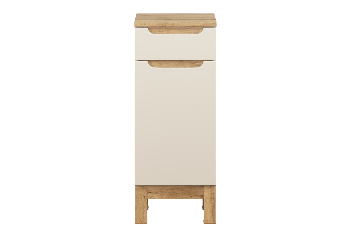 Úzká boční skříňka v dekoru kašmírově béžovém a dub Wotan dodá koupelně hřejivý a nadčasový vzhled. Dvě vnitřní police a praktický šuplík poskytují překvapivě mnoho úložného prostoru i v menší koupelně. Skříňka má integrované úchyty, tiché dovírání a stojí na elegantních, pevných nohách.