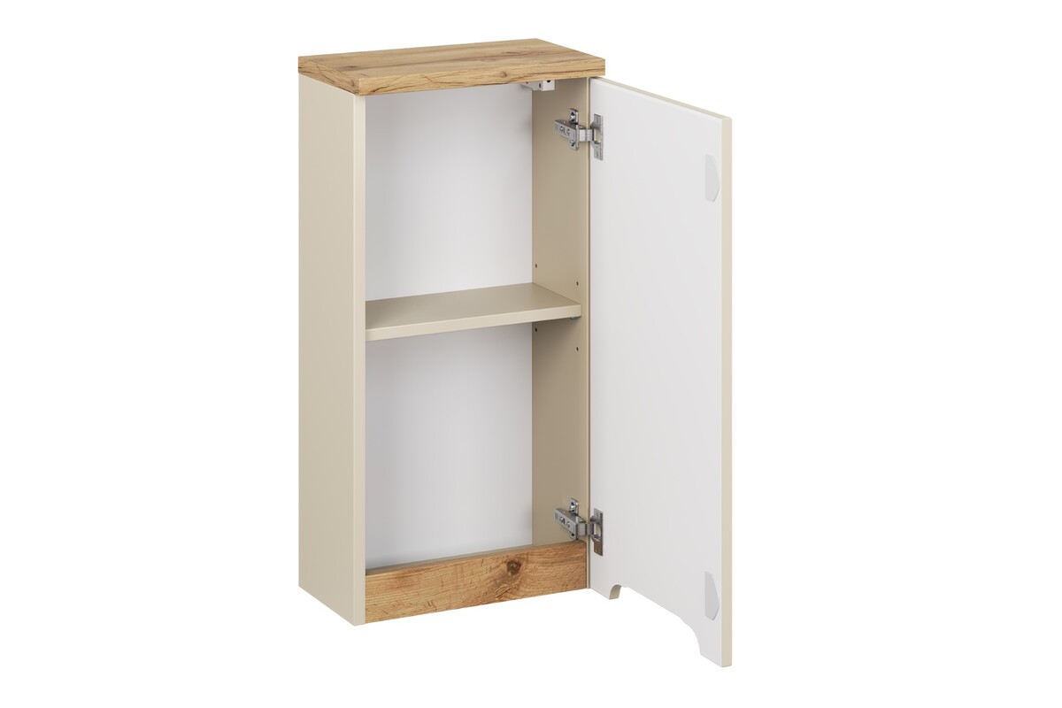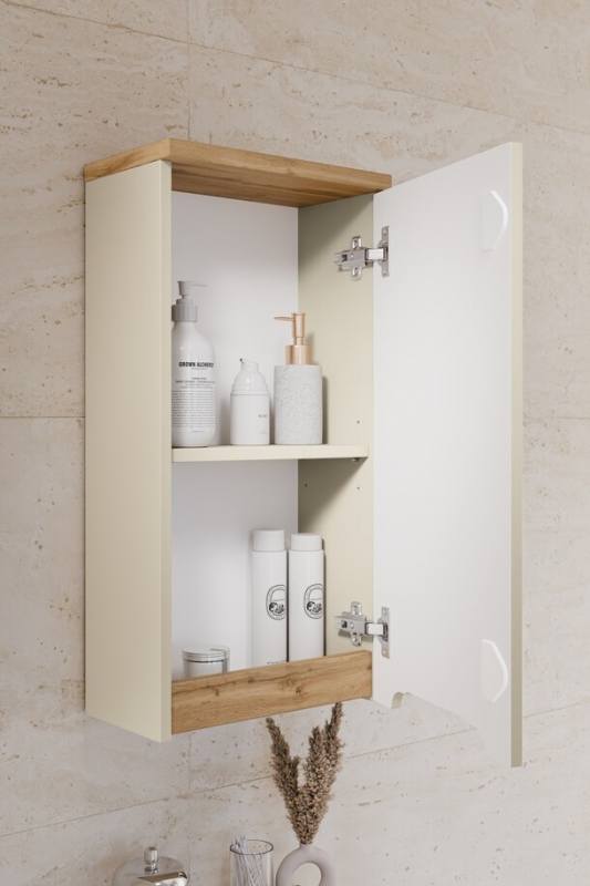Horní skříňka o šířce 35 cm z kolekce Bali Cashmere zaujme elegantní kombinací kašmírově béžové barvy a dekoru dub Wotan. Díky dvěma vnitřním policím poskytuje překvapivě dostatek místa na uložení koupelnových potřeb.