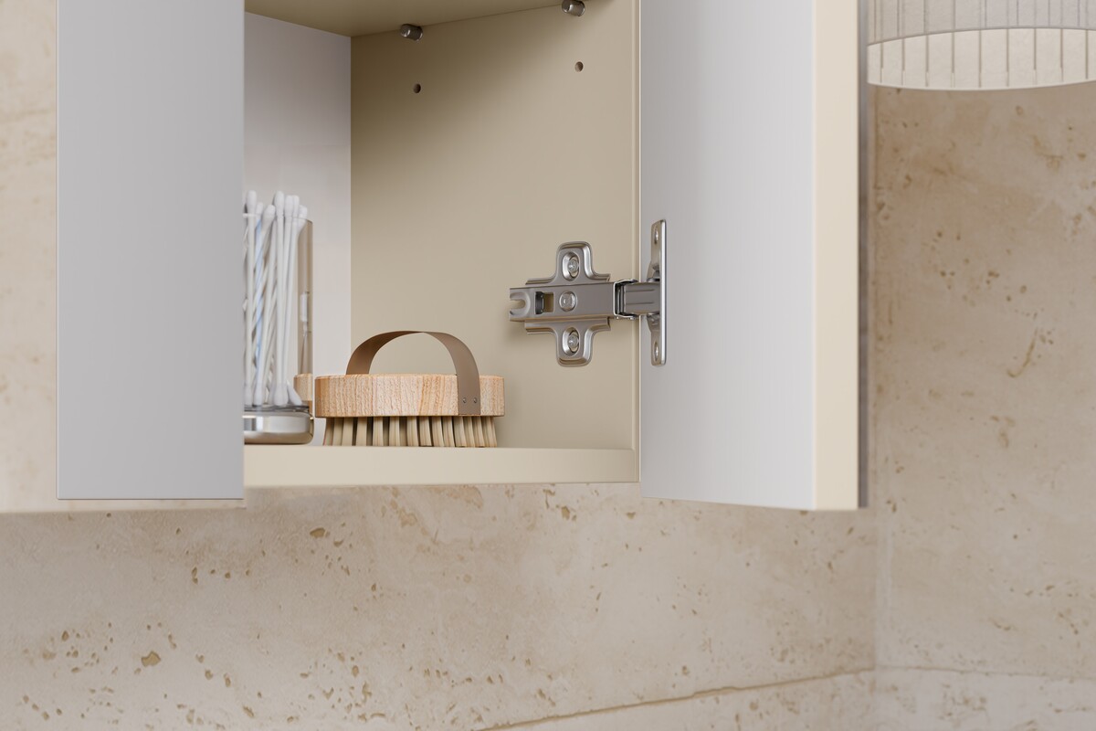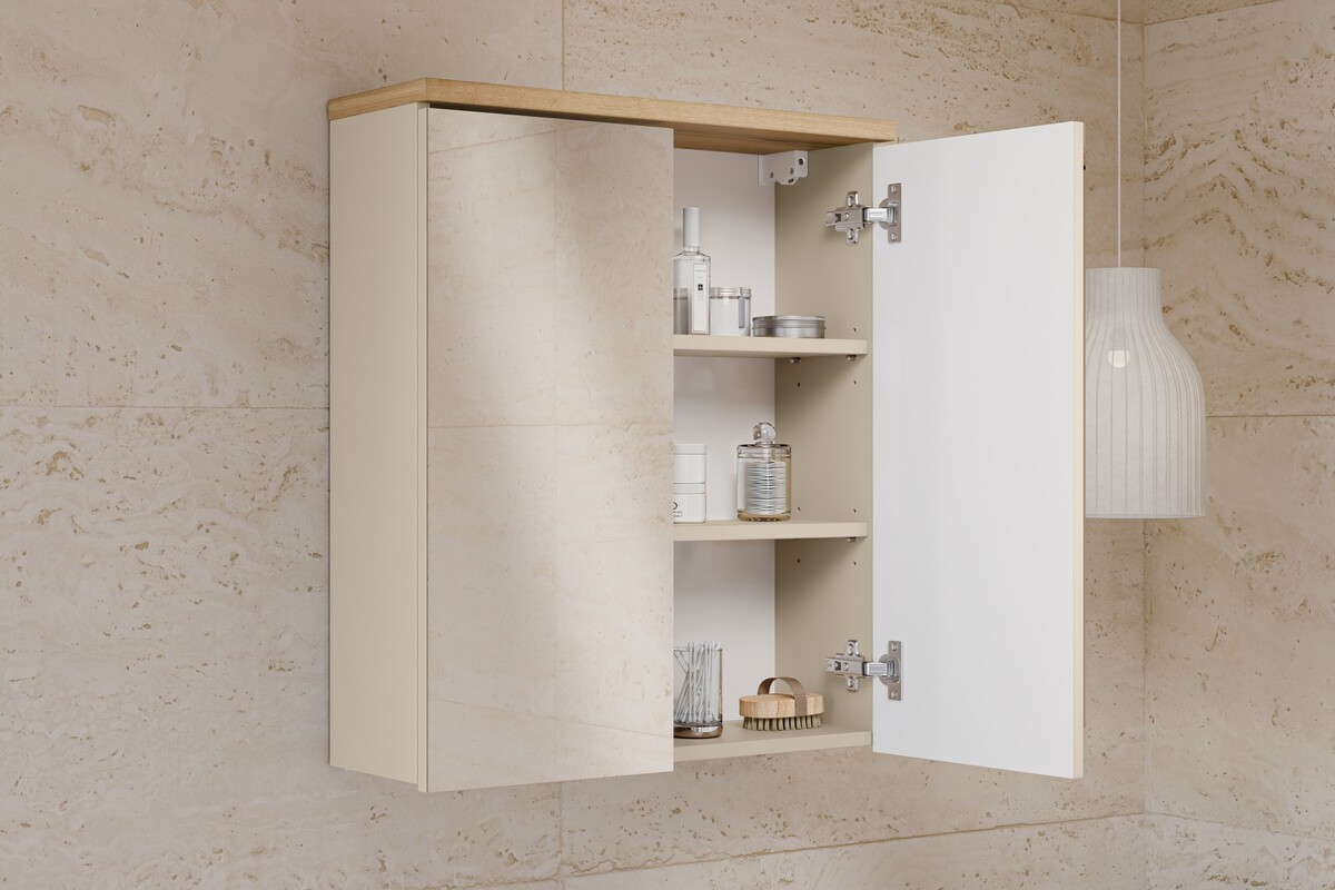 Dvoukřídlá zrcadlová skříňka o šířce 60 cm v kombinaci kašmírové béžové barvy a dekoru dub wotan vnese do interiéru teplo, klid a nadčasový styl. Nabízí 2 prostorné police, tiché dovírání dvířek a integrované úchyty, které podtrhují moderní design.