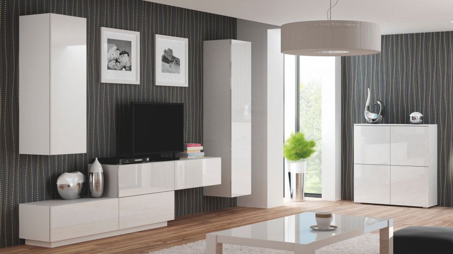 Moderní a elegantní nábytek z řady Livo následuje módní trendy se svým minimalistickým designem. Korpus závěsného televizního stolu Livo RTV-160W je vyroben z kvalitního lamina, přední dvířka jsou z MDF ve vysokém lesku.